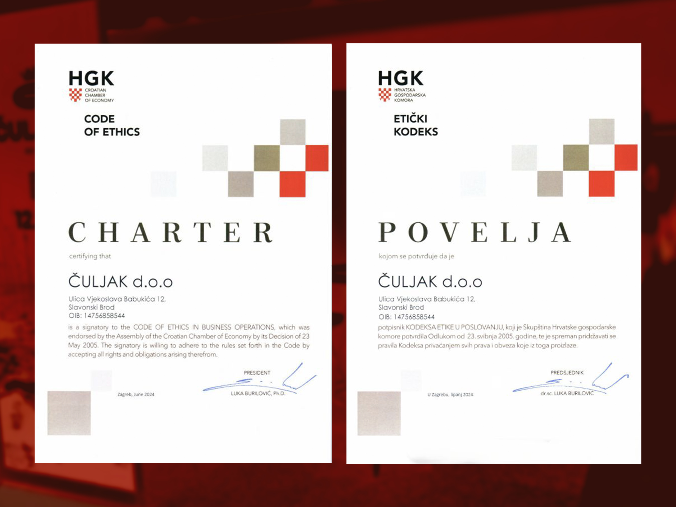 OFFICIALY! Our Company ČULJAK Ltd. is a signatory of the Croatian Chamber of Commerce Charter which is one of the main documents in transparent and fair-dealing business.